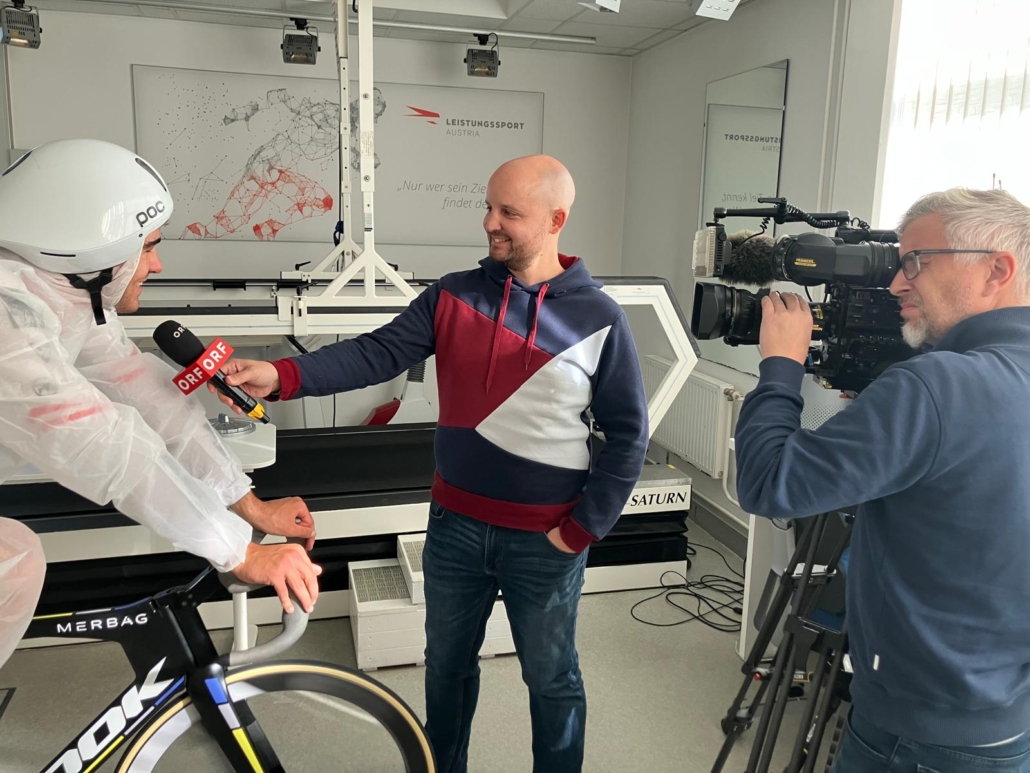 Im hyperbaren Sauerstoffzelt (Bild mitte) wiederum setzte Wafler auf die Wirkung von Sauerstoff zur Förderung der muskulären Erholung nach intensiven Belastungen. “Die Behandlung wirkt ein bisschen wie Kaffee für den ganzen Körper, man fühlt sich wach, aktiv und frisch. Es steigert aber auch das allgemeine Wohlbefinden und beschleunigt die Regeneration”, erklärte Wafler im Gespräch mit ORF-NÖ-Redakteur Matthias Eßmeister, der im nächsten Raum gleich Zeuge der nächsten Erholungseinheit wurde: bei der Magnetfeldtherapie. Gedreht wurde auch im Kraftraum von Leistungssport Austria, wo der EM-Zweite von 2024 das Kamerateam an seinen exzentrischen Kraftübungen teilhaben ließ.